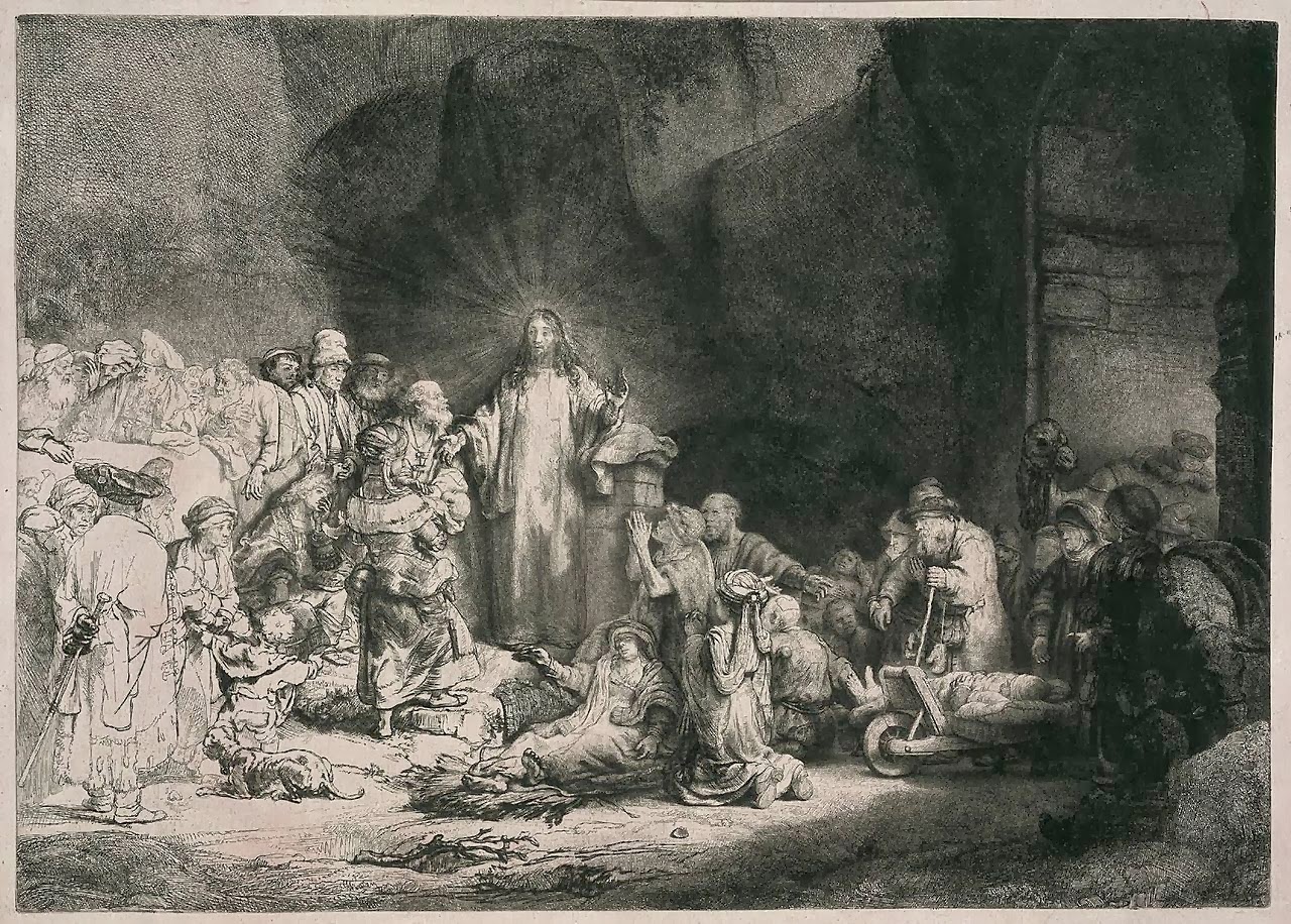 "The many contrasts in this engraving are striking: light on the left, dark on the right, high on the left, low on the right, rich vs. poor, adult vs. child, human vs. animal, Jews vs. Gentiles, healthy vs. sick, seeing vs. blind, with or without distinction, self-satisfied or begging for help, proud or kneeling." Artway